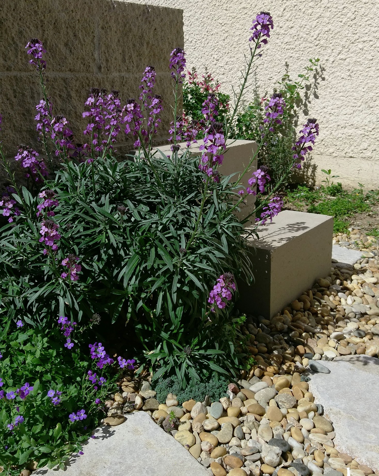 Aménager les abords d'une maison rénovéeAutour des cheminements bétonnés, le terrain nu sera revêtu d'un paillage de graviers et animé en séquences paysagères : massifs d'arbustes méditerranéens, coin lecture autour d'un banc sous l'olivier, terrain de pétanque servant de parking occasionnel.