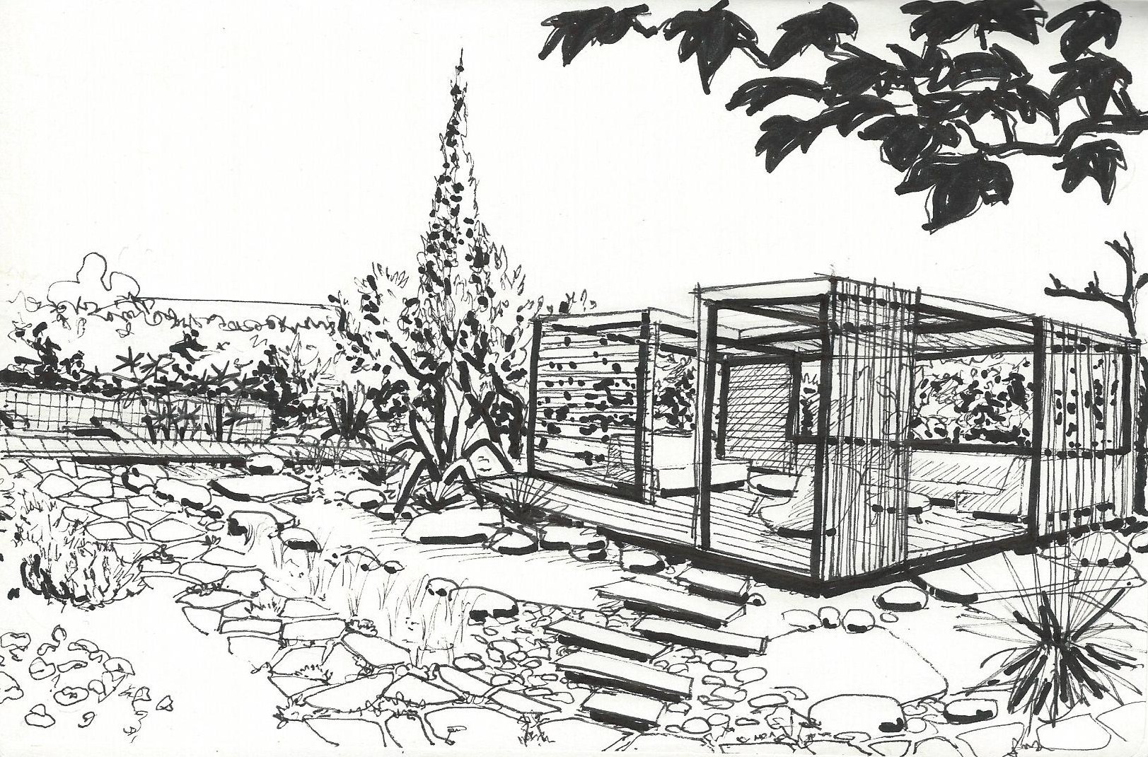 Diagnostic et analyse paysagère du site. Dessin manuel et numérique de plans, d'esquisses (3D). Dossier de conception incluant le devis.