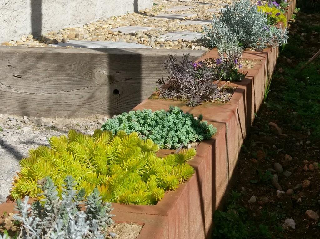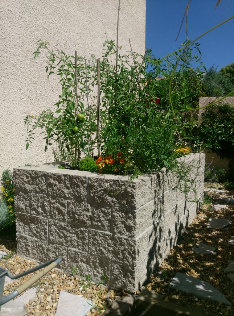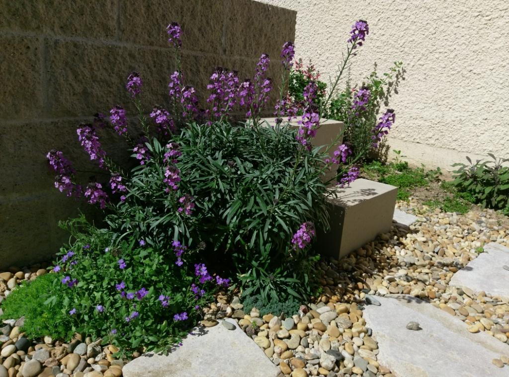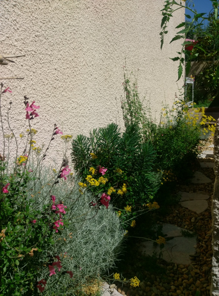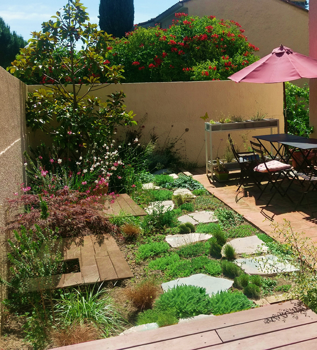 De plain pied avec la maison, la partie principale du jardin est parcourue par des pas japonais en calcaire des Causses, semée de plantes méditerranéennes alternatives au gazon devant un massif de fleurs et d'arbustes typiques des jardins secs (hormis l'érable du Japon prévu dans le cahier des charges).