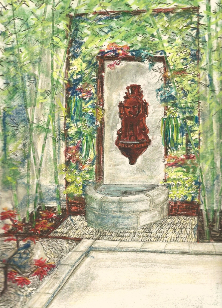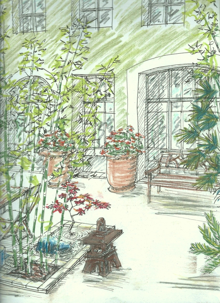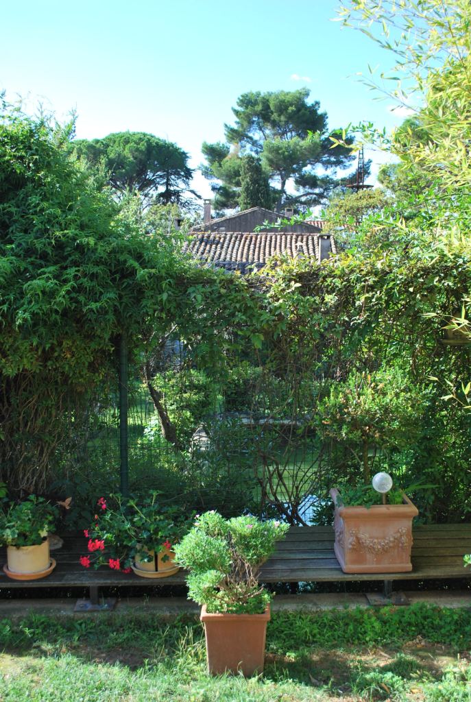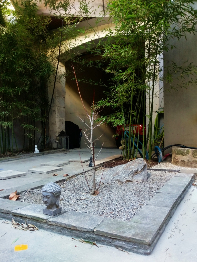 De plain pied avec la maison, la partie principale du jardin est parcourue par des pas japonais en calcaire des Causses, semée de plantes méditerranéennes alternatives au gazon devant un massif de fleurs et d'arbustes typiques des jardins secs (hormis l'érable du Japon prévu dans le cahier des charges).