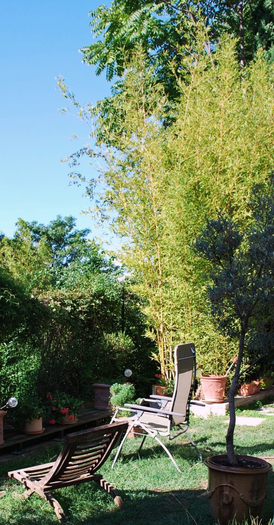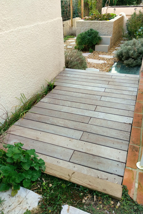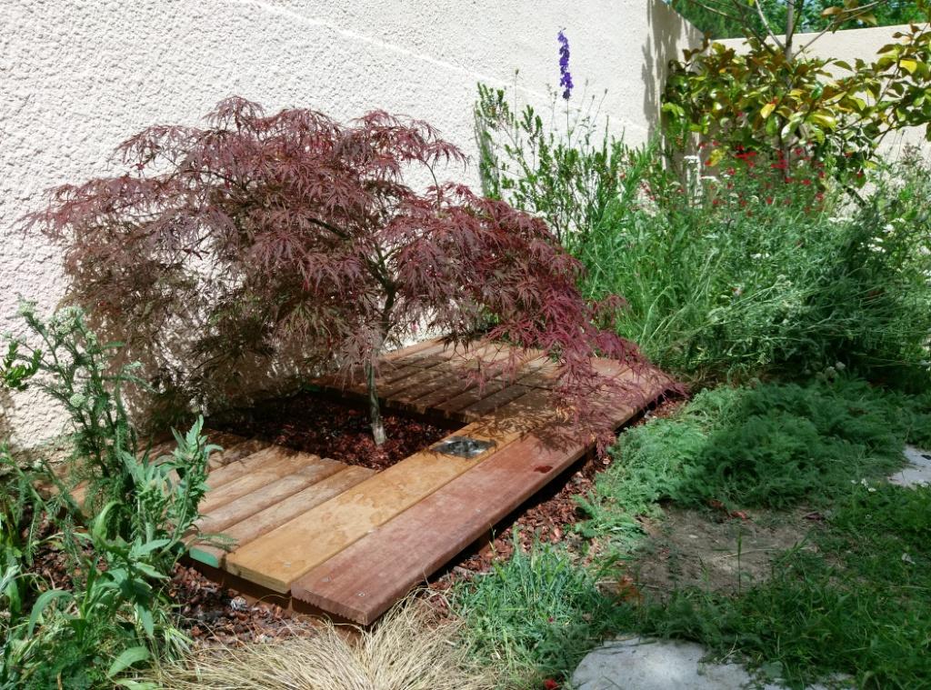 Déjà occupé par un massif de Terre de bruyère, un Magnolia grandiflora et une terrasse pavée de terre-cuite, ce petit jardin en bande, orienté au nord, est structuré par une succession de paliers de bois qui encaissent le dénivelé entre la rue, la maison et la suite du jardin.